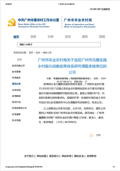 近期,广州市委农办暨市农业农村局为加强对广州推进实施乡村振兴战略工作研究,深入贯彻党的十九大关于乡村振兴战略的重大战略部署,围绕争当全省乡村振兴示范和表率以及“到2022年乡村振兴取得显著成效”的要求,加快推进珠三角核心区域城乡深度融合和农业农村现代化,按规定程序招标并经组织评审,于近日公示确定委托suncitygroup太阳官方网站农村法治与社会发展研究中心开展该重要课题研究工作——要求分析2018年以来广州实施乡村振兴战略进展情况,比较分析省内外同类城市乡村振兴重要指标数据,研究提出完善广州实施乡村振兴战略政策支持体系的决策建议。