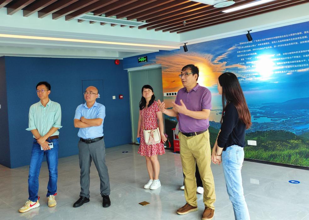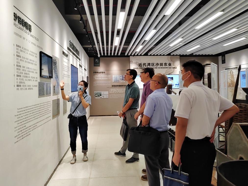 下午,调研组驱车赶往设在东涌镇的广东国际渔业高科技园,在科技园展览负责人郭晓奇、方琼玟等陪同下参观了广东渔业历史文化展厅和广东渔业发展成果展,调研组边参观边与布展具体负责人交流岭南渔业历史研究心得和资料,特别是近现代广东渔业科技成就。作为广东三届渔业种业科技博览会举办地,科技园建有多项高科技成果中试基地和试验。调研组考察了高密度循环水育苗技术、鱼塘种稻关键技术研发试验、工厂化养殖与鱼菜共生系统,以及珠江流域水产种质资源库等,感受到了该园区渔业种业发展的新成就,并对广东渔业科技发展有了更全面的了解和认识。