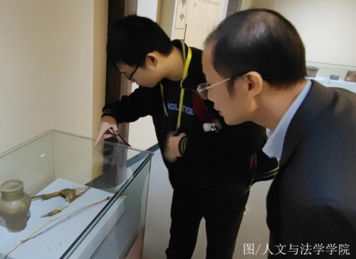 图八 王福昌教授、彭德研究生察看梯田生产工具