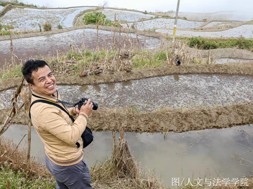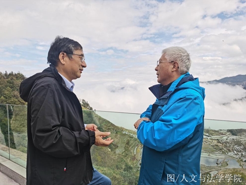 图十二 在坝达梯田与闵庆文教授商讨岭南农遗发展