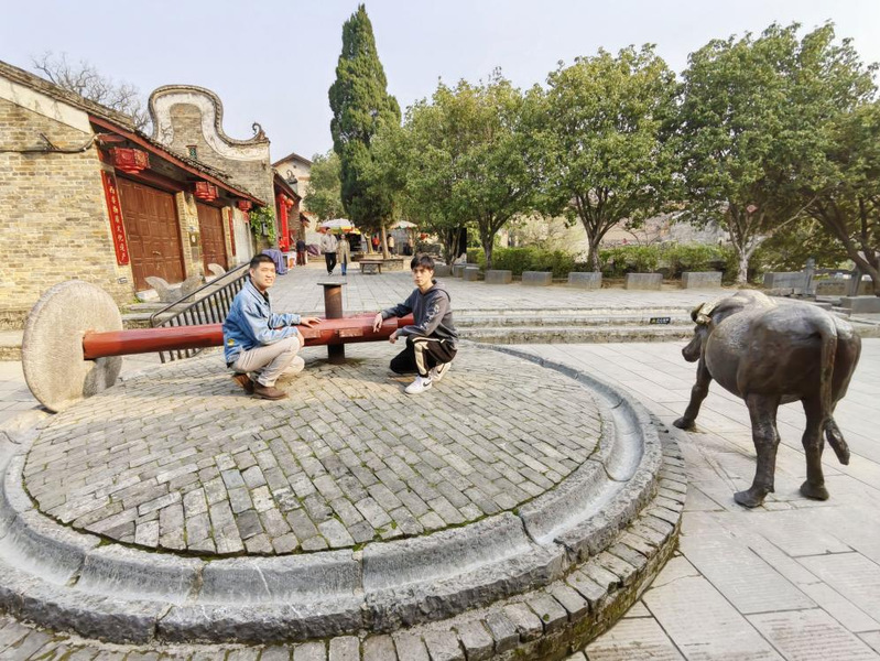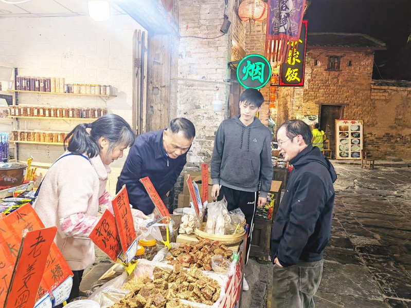 2月27日晚,考察团队来到中国历史文化名镇黄姚古镇。该镇地处昭平县,是座岭南文化与峰丛山水完美融合的古镇,始建于宋开宝年间。当晚和次日清晨,考察团队两度入古镇,倪教授、王教授领着大家考察了古镇的布局,该镇同姓民居建筑多以祠堂为中心修建并向外辐射,600多座古建筑呈现九宫八卦阵式布局。粉墙黛瓦、街巷幽深,8条主街道全部用黑色石板镶嵌而成。诗联碑刻,意境隽永,素有“诗境家园”的“小桂林”之称。并且为学生讲解了古村落的具体布局。考察团队还重点调研了野山姜红糖、捻子酒、橘红、野生小黑桔、野生老树梅等古镇物产,尤其是有黄姚三宝之称的豆豉和各色酱菜。通过考察对南岭古镇建筑肌理和风貌,以及丰富农产有了更深入了解。