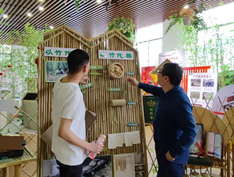 中午,考察团队驱车赶往有中国“竹子之乡”之称的广宁县,该县生长有青皮竹、筋(簕)竹、观音竹、撑篙竹、苦竹等14属55种竹子,其中青皮竹是当地最主要竹种,全国青皮竹中心产区,故又称“广宁竹”。在品尝竹虫、竹笋等充满竹味午餐后,考察团队首先考察绥江边的竹海大观,景区内翠竹绵延,浩如烟海,考察团队先乘游览车穿越由100多种2800株(丛)竹子组成的竹林,感受竹子的灵秀与峻逸。接着重点参观竹生态艺术馆、竹艺坊,前者,考察团队考察了古今竹子利用的实物,从传统竹子编织到现代竹类加工成果。后者,观看附近村民现场编织和竹制品摆卖。深感我国人民在竹类利用上成就丰硕。在返校之前,倪教授、王教授一行还专程去了广宁博物馆,观看了粤桂湘边纵队史迹陈列、广宁古代文物陈列、广宁农民运动陈列。在对广宁县出土古代文物了解同时对土地革命时期如火如荼的农民运动均有了更深的认识。