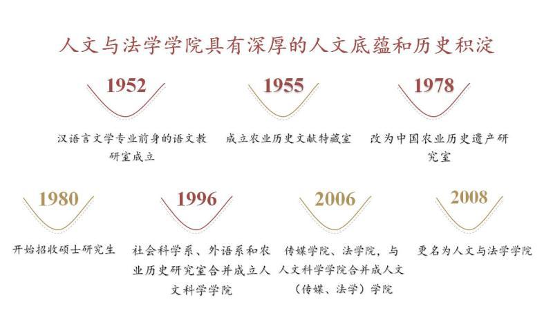 学院形成多层次较完备的办学体系,现设有法学、汉语言文学、历史学3个本科专业,均面向全校招收双学位学生,拥有科学技术史、中国史、法律硕士、农业硕士(农村发展领域)四个硕士点。自2016年起,学院成为全校四个学分制试点改革的学院之一。